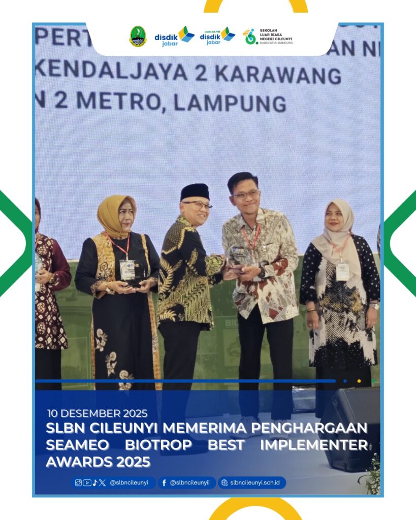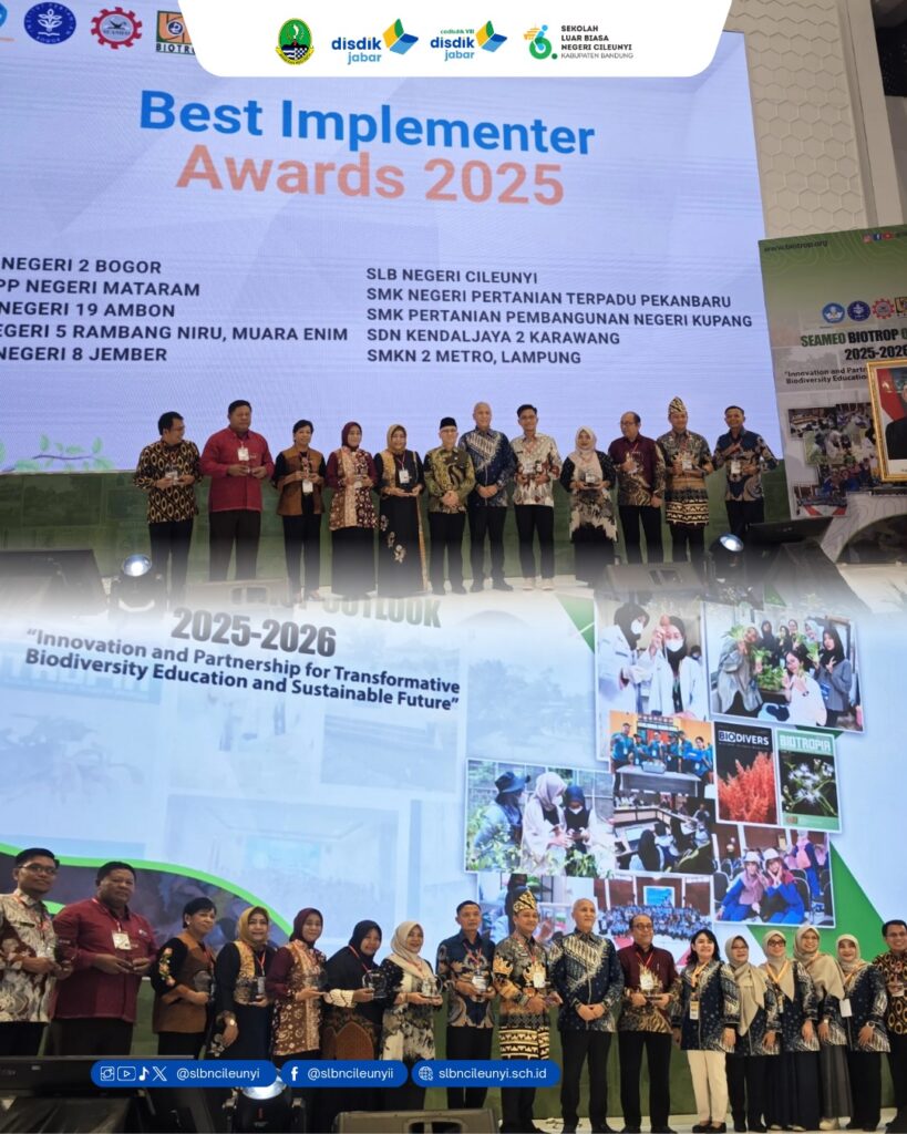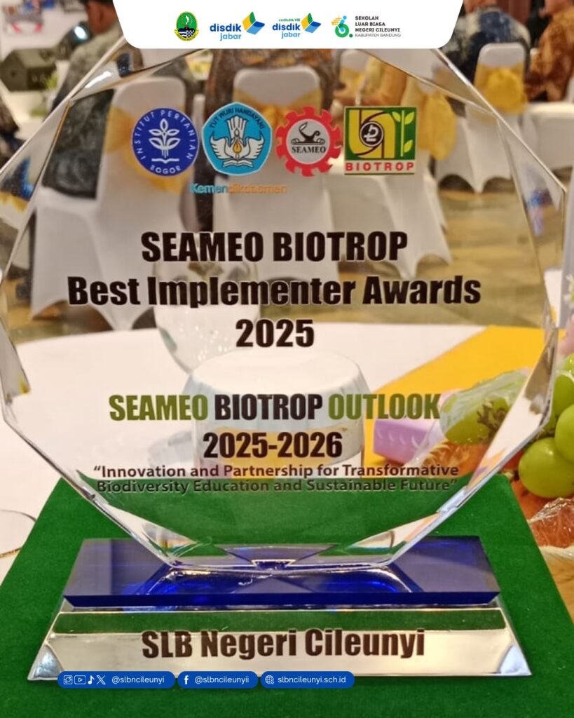 SLBN Cileunyi kembali menorehkan prestasi membanggakan di tingkat Nasional dengan menerima Seameo Biotrop Best Implementer Awards 2025. Penghargaan ini diberikan atas keberhasilan sekolah dalam mengimplementasikan inovasi dan praktik baik pengembangan pertanian perkotaan, mulai dari proses mengolah lahan, menanam, merawat, memanen hingga memasarkan hasilnya secara berkelanjutan.